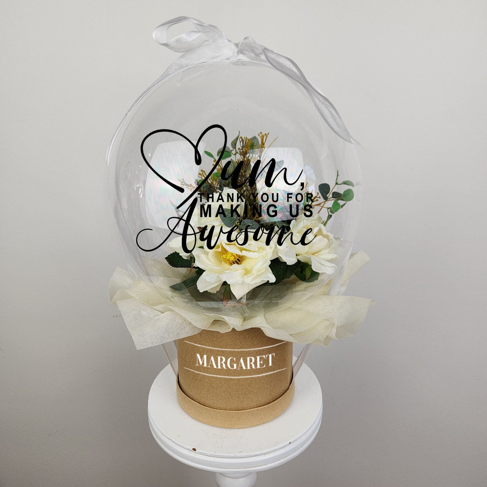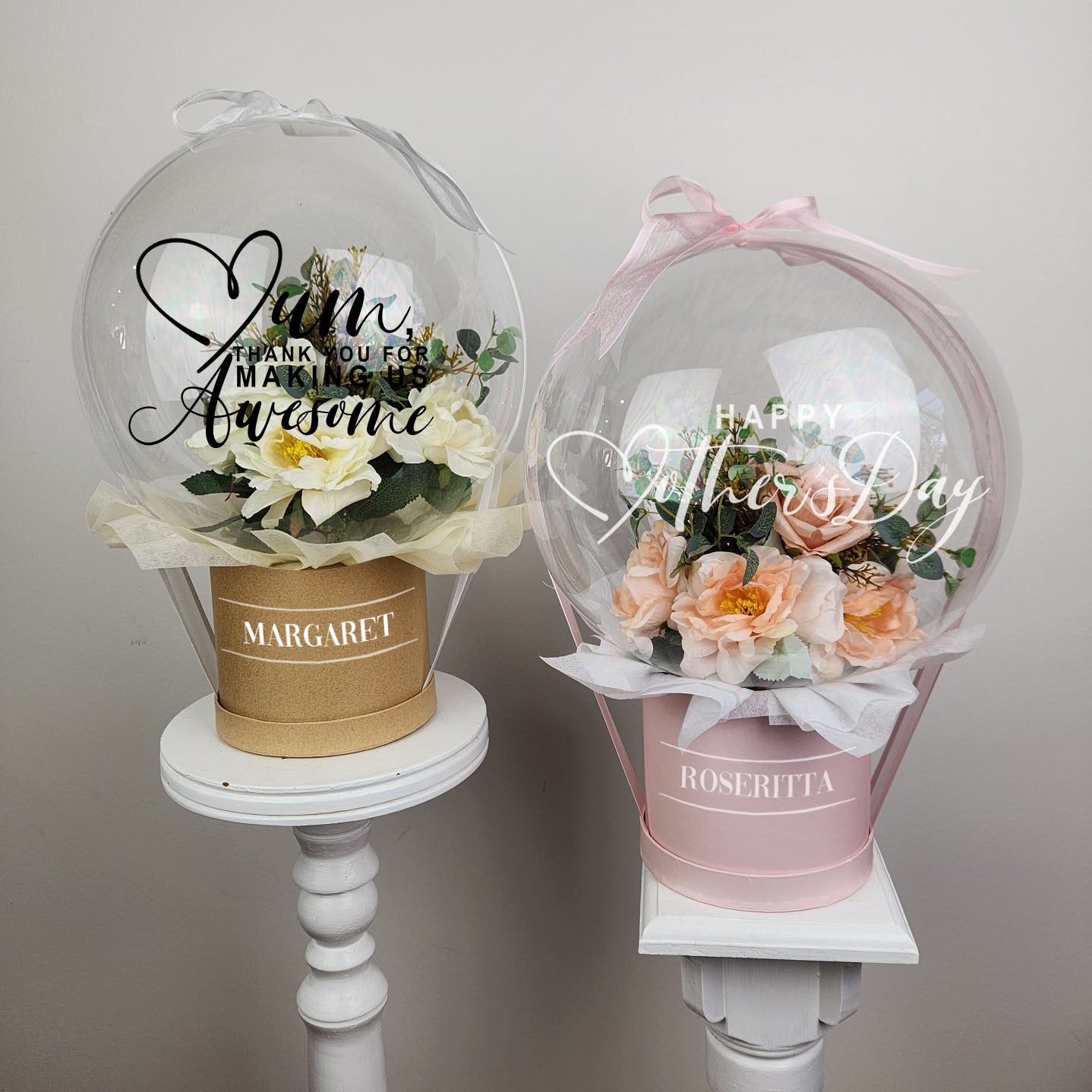 Talk about being in a bubble! These faux flowers that look real but lasts forever more, beautifully displayed inside a personalized bubble.